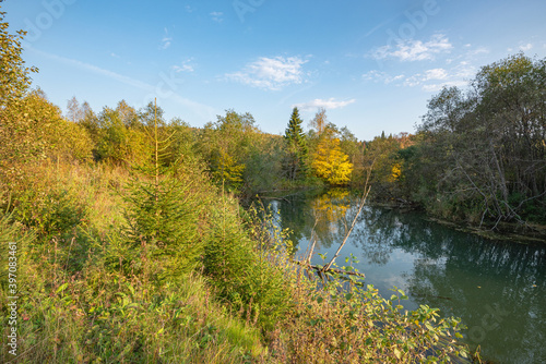 The watermark will not be included on Wall mural.: Autumn forest trees are reflected in the river water of the panoramic landscape - blue sky with cloud
