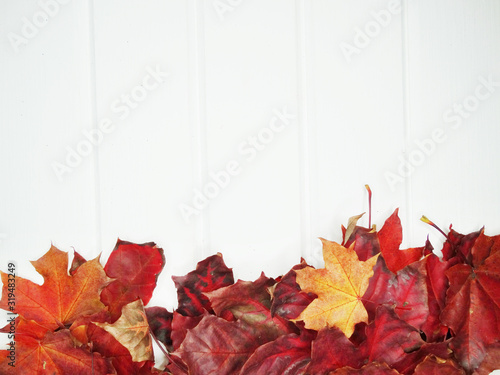 The watermark will not be included on Wall mural.: Autumn forest with maple trees on wooden background