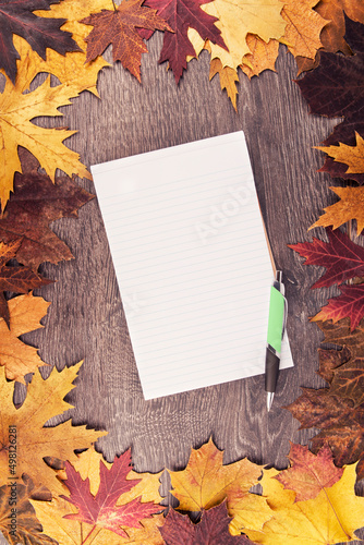 Wall mural : Autumn leaves and notepad disposed on wooden table in the background - view from above -