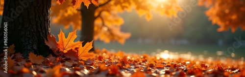 The watermark will not be included on Wall mural.: Autumn leaves at the base of a tree trunk in warm sunlight with a soft, scenic background