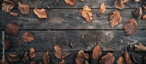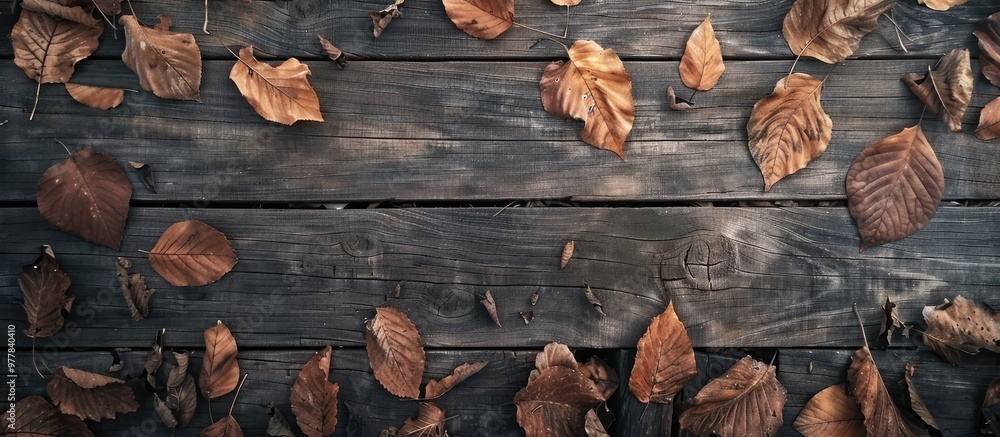 Wall mural autumn leaves on a wooden surface. copy space image. place for adding text and design