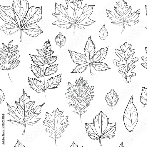 The watermark will not be included on Wall mural.: Autumn leaves seamless pattern black and white doodle style line drawing vector illustration - leaves