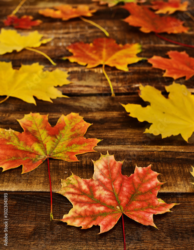The watermark will not be included on Wall mural.: Autumn maple leaves background on on horizontal arranged boards - top view wooden table vertical fram