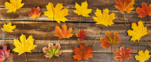 Wall mural autumn maple leaves background on top view wooden table horizontal frame. - Wall murals Wall mural autumn maple leaves background on top view wooden table horizontal frame. - Wall murals