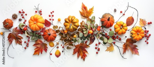 The watermark will not be included on Wall mural.: Autumn-themed arrangement of leaves, pumpkins, and berries on a white backdrop - suitable for display