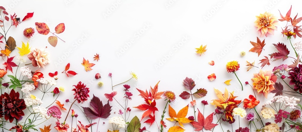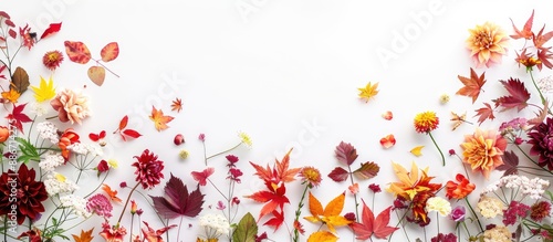 Wall mural autumn themed arrangement with flowers and leaves on a white background overhead view with space for