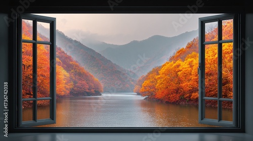 The watermark will not be included on Wall mural.: Autumn view through an open window showcasing a serene lake surrounded by mountains adorned with fal