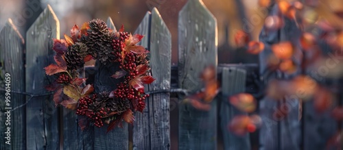 Wall mural autumn wreath on a wooden fence close up shot. copy space image. place for adding text and design - Wall murals Wall mural autumn wreath on a wooden fence close up shot. copy space image. place for adding text and design - Wall murals