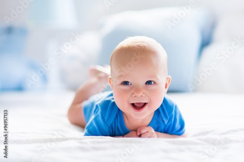 The watermark will not be included on Wall mural.: Baby boy in white sunny bedroom