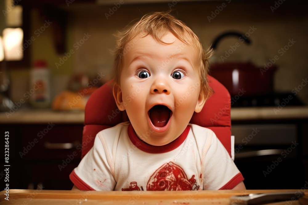 Wall mural baby trying a new flavor with a surprised but delighted expression. - Wall murals Wall mural baby trying a new flavor with a surprised but delighted expression. - Wall murals