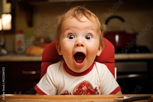 The watermark will not be included on Wall mural.: Baby trying a new flavor with a surprised but delighted expression -