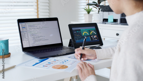 Wall mural : Back rear view of young asian woman, freelance data scientist work remotely at home coding programin