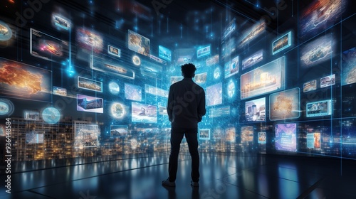 Wall mural back view a man stands in front of multiple screens displaying various social media platforms, anima - Wall murals Wall mural back view a man stands in front of multiple screens displaying various social media platforms, anima - Wall murals