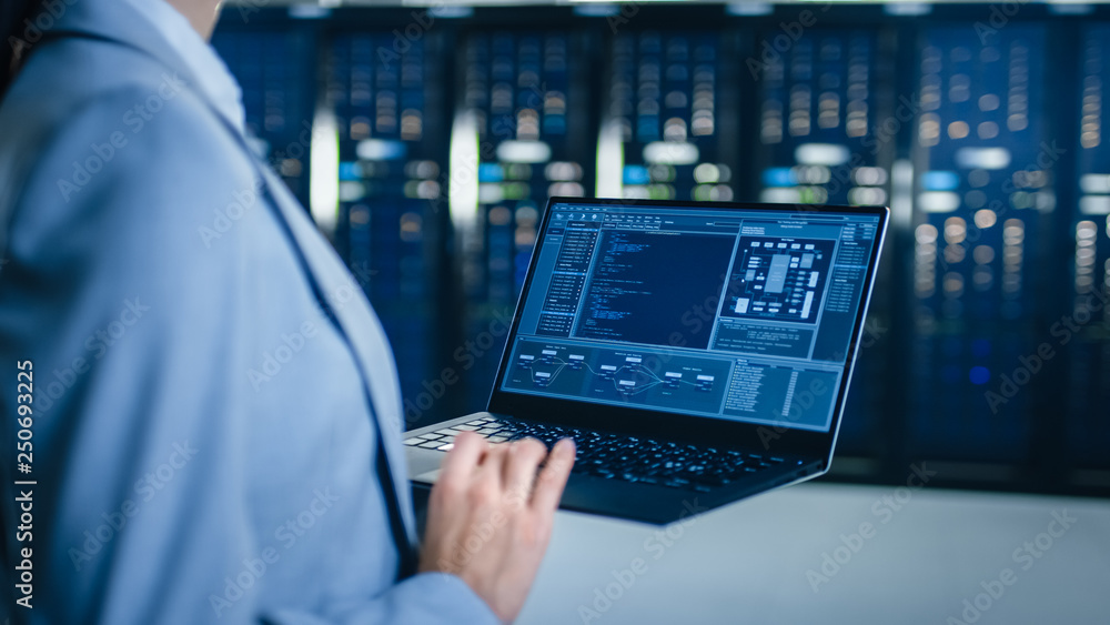 The watermark will not be included on Wall mural.: Back view close up shot of an it specialist working on laptop in data center next to server racks - c