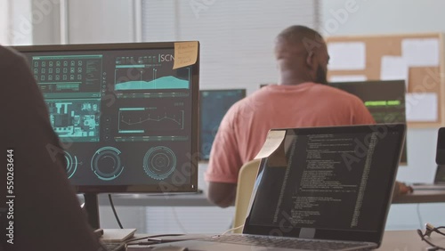 The watermark will not be included on Wall mural.: Back view of concentrated software developers coding and examining pcb design software while working