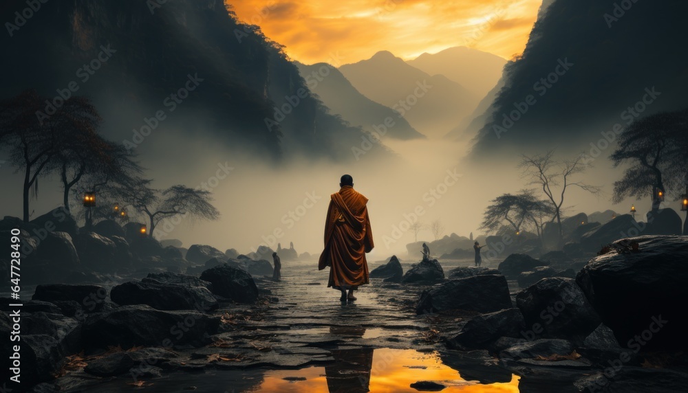 Wall mural : Back view of monk walking in a mountain with amid mist