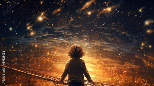 The watermark will not be included on Wall mural.: Back view of the silhouette of a child in front of a fantasy scene of the universe