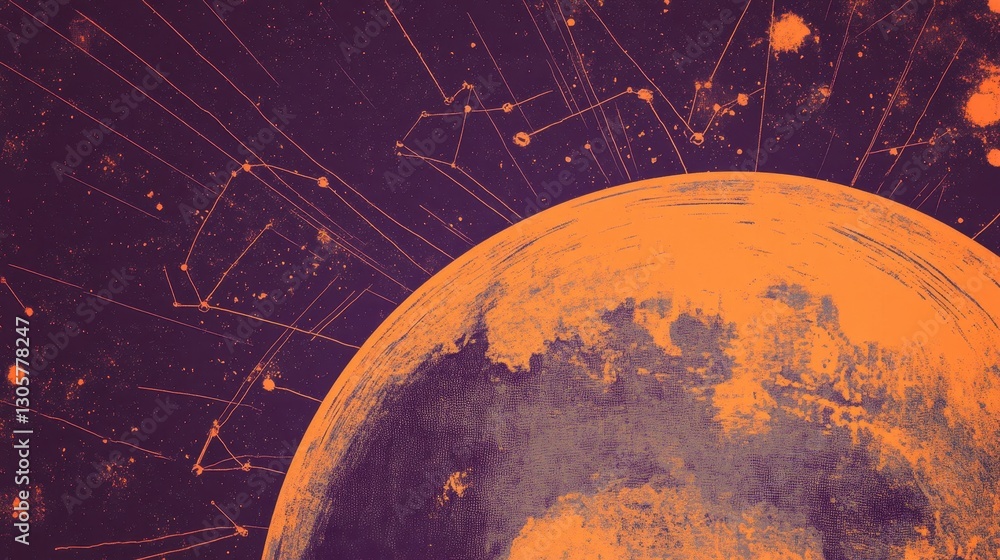 Backdrop of a vintage sci-fi globe glowing cosmic symbols and faded halftone constellationsWall mural