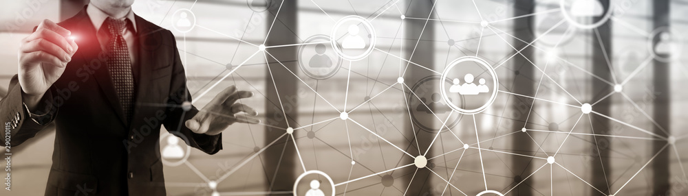 Wall mural background conceptual image with social connection lines on panoramic fone.