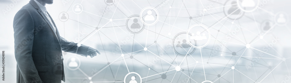 Wall mural background conceptual image with social connection lines on panoramic fone.
