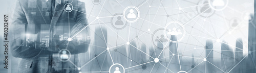 Wall mural background conceptual image with social connection lines on panoramic fone.