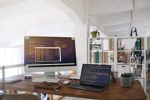 Wall mural background image of black and orange programming code on computer screen and laptop in contemporary