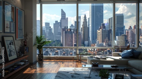 The watermark will not be included on Wall mural.: Background image of clear daylight view of modern skyline through large windows - window view of city
