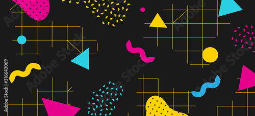 Wall mural background in the style of the 80s with multicolored geometric shapes on the black background. illus