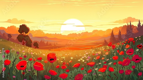 Wall mural background meadow with poppies. the charm of a meadow filled with colorful poppies in a captivating  - Wall murals Wall mural background meadow with poppies. the charm of a meadow filled with colorful poppies in a captivating - Wall murals