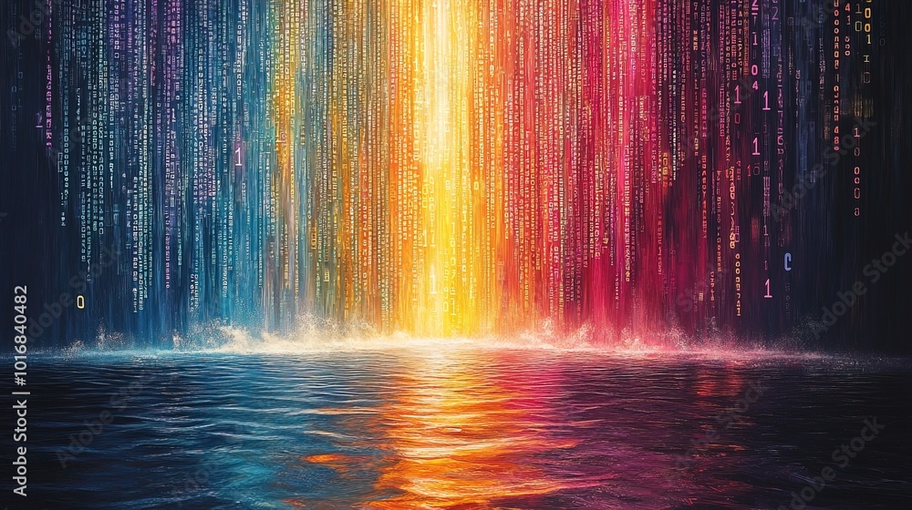 Wall mural background of an abstract digital code waterfall with cascading numbers and symbol