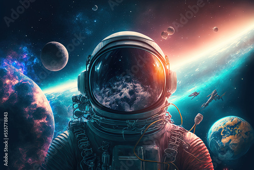 The watermark will not be included on Wall mural.: Background of an astronaut with planets in space - generative ai