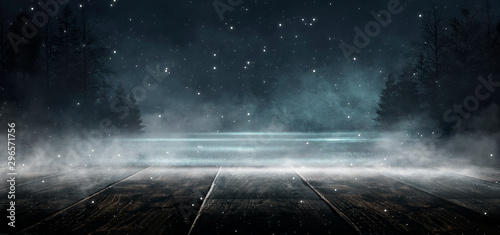 Wall mural background of empty dark scene with wooden old floor. neon light smoke. dark abstract background