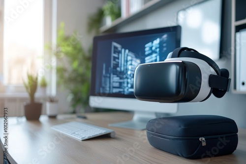The watermark will not be included on Wall mural.: Background shot of contemporary computer programmer office setup with vr headset in carrying case on