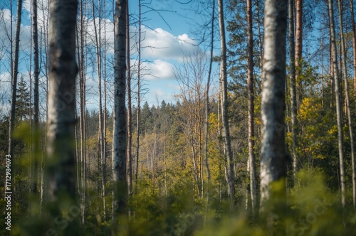 The watermark will not be included on Wall mural.: Background texture featuring slender trees in a summer forest setting