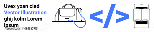Wall mural : Backpack with cord loop, blue coding symbol, white open book with black lines - ideal for tech blogs,