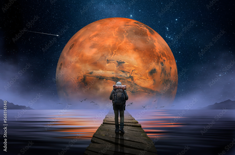 Wall mural backpacker walking on wooden footbridge with planet mars in the background