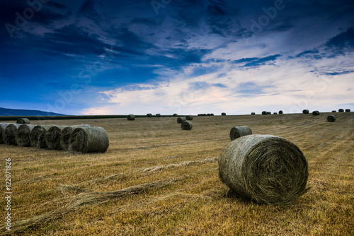 The watermark will not be included on Wall mural.: Baled hay rolls at sunset