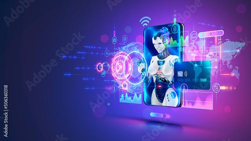 Wall mural banking chat bot with ai on screen phone. artificial intelligence in fintech. chatbot service of onl - Wall murals Wall mural banking chat bot with ai on screen phone. artificial intelligence in fintech. chatbot service of onl - Wall murals