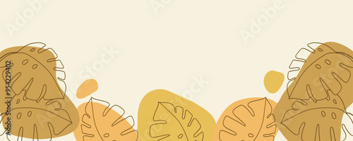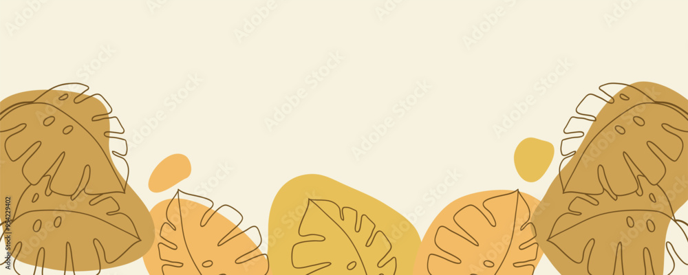 The watermark will not be included on Wall mural.: Banner background including line drawing of leaf monstera modern boho single line art -