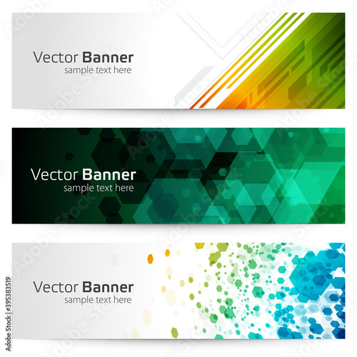 Wall mural : Banner with abstract polygons and lines vector template - green geometric cluster hexagons and techno