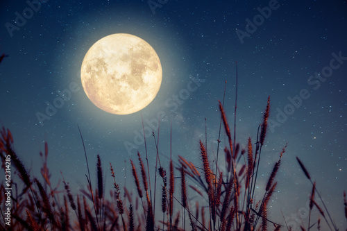 Wall mural beautiful autumn fantasy - maple tree in fall season and full moon with milky way star in night skie