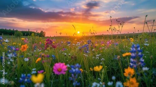 Wall mural beautiful field with colorful wild flowers foggy landscape at sunrise or dawn - Wall murals Wall mural beautiful field with colorful wild flowers foggy landscape at sunrise or dawn - Wall murals