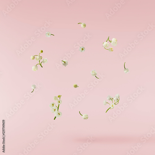 Wall mural beautiful lily of the valley flower falling in the air isolated on pink background. levitation or ze - Wall murals Wall mural beautiful lily of the valley flower falling in the air isolated on pink background. levitation or ze - Wall murals