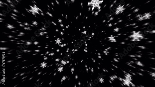 The watermark will not be included on Wall mural.: Beautiful loop falling moving white star flakes particles radial blurred animation on black abstract