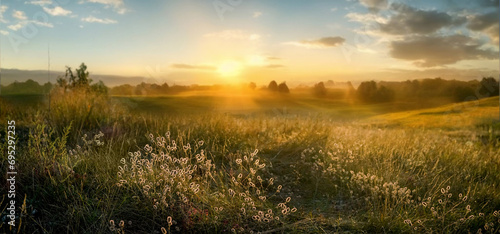 Wall mural beautiful natural panoramic countryside landscape. blooming wild high grass in nature at sunset warm - Wall murals Wall mural beautiful natural panoramic countryside landscape. blooming wild high grass in nature at sunset warm - Wall murals