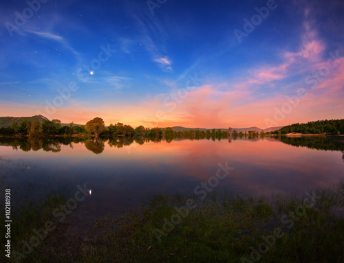 Wall mural beautiful night landscape on the mountain lake with stars and reflected clouds in water in spring. c