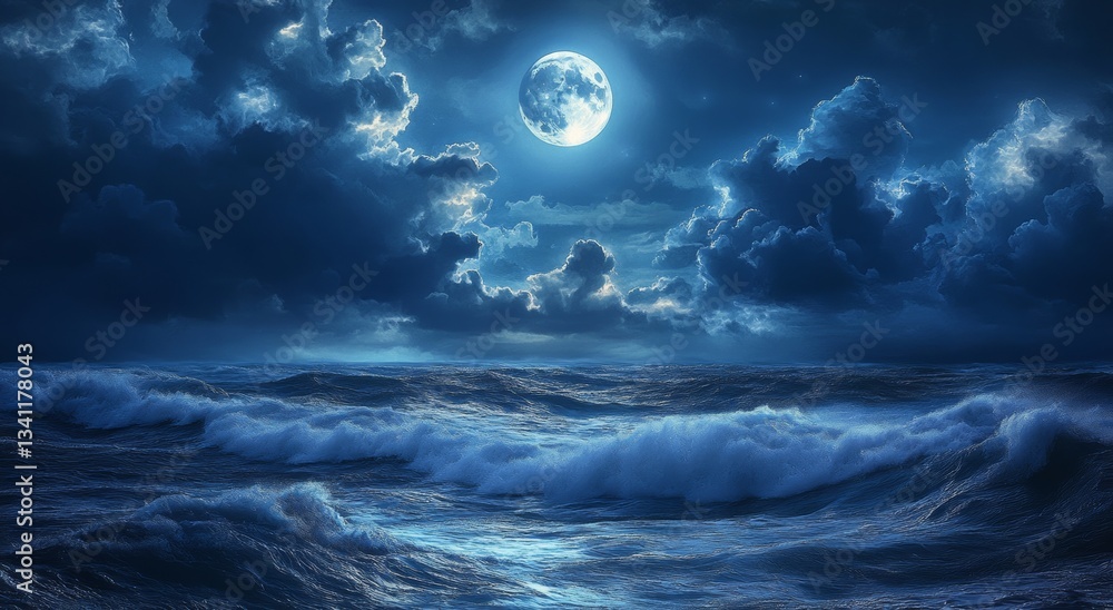 The watermark will not be included on Wall mural.: Beautiful ocean scene with a large moon and clouds in the night sky, a fantasy landscape -