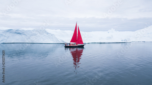 Wall mural : Beautiful red sailboat in the arctic next to a massive iceberg showing the scale - aerial view as vi