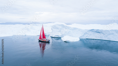 Wall mural : Beautiful red sailboat in the arctic next to a massive iceberg showing the scale - aerial view as vi