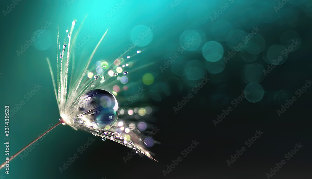 Wall mural : Beautiful shiny dew water drop on dandelion seed in nature - close-up macro - sparkling bokeh - dark bl